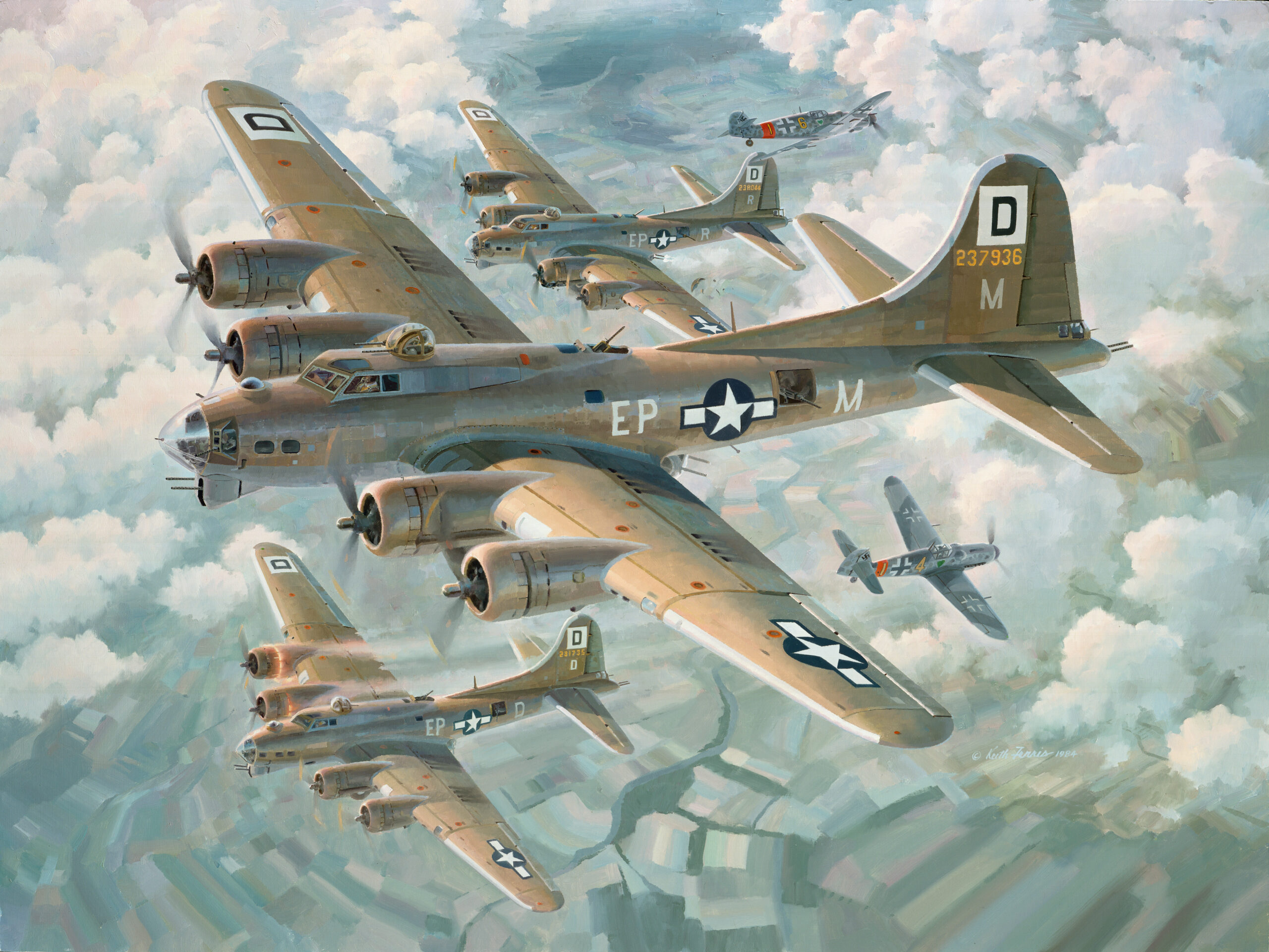This painting depicts the action around the 351st Bomb Squadron as III./JG 54 Messerschmitt 109 pilots, Feldwebel Friedrich Unger in “6”, and Unteroffizier Erwin Muller in “4”, pass close aboard Lt. Richard Hemlmick’s undamaged B-17, letter “M”, and the mortally wounded B-17s of Lt. George Brannon, letter “D”, and Lt. Merril Rish, letter “R”. Both B-17s went down. The two Messerschmitts were also hit and made forced landings below the action. The Germans had put up 528 fighter sorties against the bomber force and lost 68 aircraft destroyed and 16 damaged.