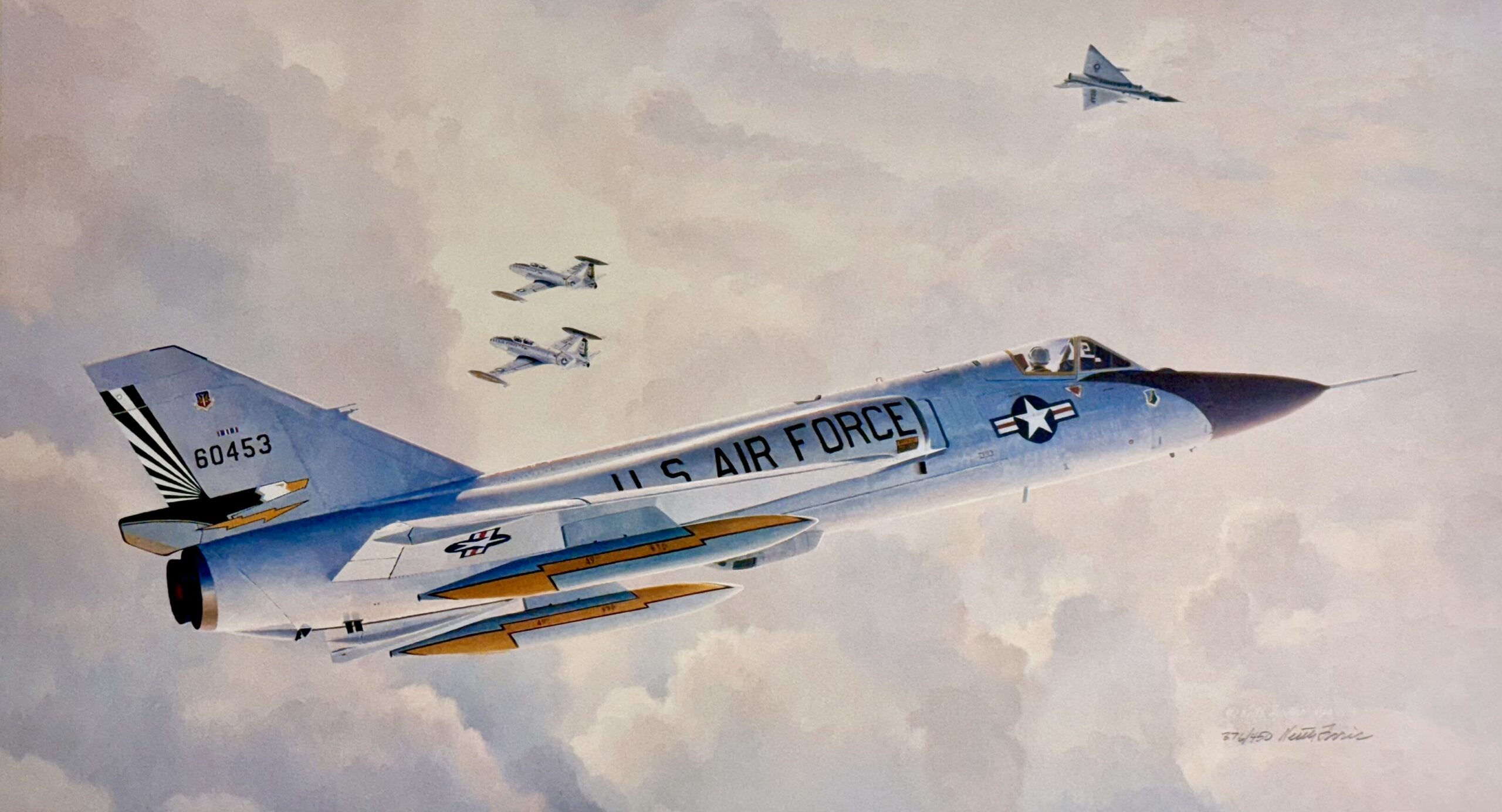 When the painting was created in 1986 this F-106 of the 49th Fighter Interceptor Squadron at Griffiss AFB, New York had been flying for 30 years