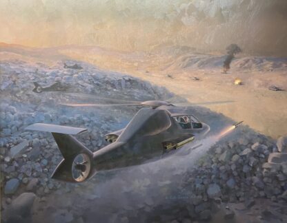 Created for Boeing Sikorsky LHX (light helicopter program) advertising as the manufacturing team successfully completed for the Army’s new Comanche Helicopter Program, the painting shows this artist’s impression of the stealthy helicopter engaging enemy tanks in a desert environment. Wass this a 1988 preview of the Desert Storm Campaign? Printed for Boeing/Pratt & Whitney published as a poster 1988.